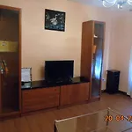 TV, 작은 부엌, 소파가 있습니다. 욕실에는 목욕 시트, 수건도 있습니다.